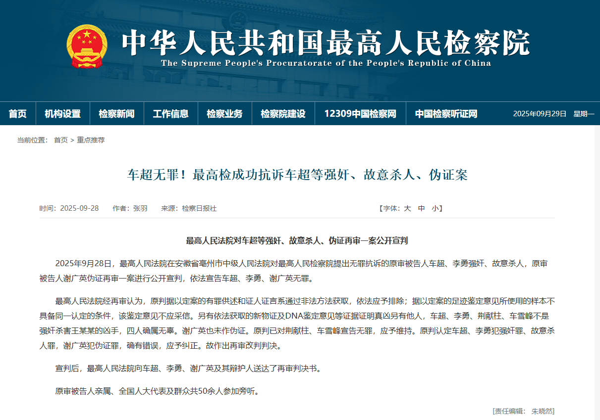 閱讀更多...2025年9月28日,最高人民法院在安徽省亳州市中級(jí)人民法院對(duì)最高人民檢察院提出的無(wú)罪抗訴案進(jìn)行公開(kāi)宣判,依法宣告車(chē)超、李勇、謝廣英無(wú)罪。 最高法經(jīng)再審查明,原判定案的口供和證言系非法獲取,依法應(yīng)予排除;所謂足跡鑒定缺乏同一認(rèn)定條件,不應(yīng)采信。反之,新物證及DNA鑒定證明另有真兇,車(chē)超、李勇、荊獻(xiàn)柱、車(chē)雪峰并非兇手,謝廣英亦未偽證。原審將車(chē)超、李勇判處死刑、無(wú)期徒刑,將謝廣英定罪入獄,確屬嚴(yán)重錯(cuò)誤。