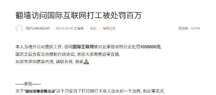 2023年9月24日,一位微博用戶聲稱自己因為使用翻墻技術(shù)在GitHub上工作而被河北承德公安局雙橋分局處以上百萬元的罰款。根據(jù)其答辯狀,這名男子在2019年至2022年期間涉嫌在GitHub上接受公司任務(wù)、編寫代碼,回答用戶問題,并使用Zoom進(jìn)行遠(yuǎn)程辦公。根據(jù)相關(guān)處罰規(guī)定,由于上述行為被視為違法,他被罰款200元,并沒收1058000元的違法所得。該程序員稱,國慶之后會在當(dāng)?shù)靥崞鹦姓V訟,并在網(wǎng)絡(luò)上尋求律師的幫助。
